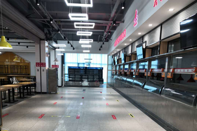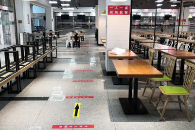 学生食堂就餐人员密度大、供餐时间长,是疫情防控的重点。学校饮食服务管理中心坚持把“师生生命安全和身体健康放在第一位”,采取了硬核防控措施。就餐现场硬核防控,学生必须佩戴口罩进入食堂,食堂设立了临时观测区,体温异常者立即联系学校医院,送到临时隔离点。各食堂制订了严格的就餐流程,并张贴了显著标识。入口→测体温→脚消毒→洗手→每隔1米外排队取餐→出口。食堂同向单侧准备了餐椅,原则上不允许学生在食堂就餐,确有需要,要求“一人一桌,同向就餐”,设立了多个温馨提示。