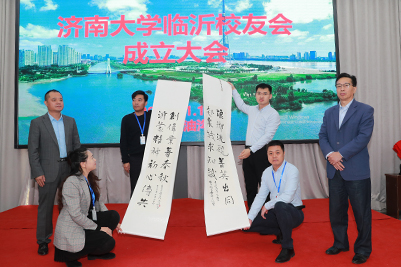 会上,李子燕校友代表临沂校友会向母校赠送纪念品。王玉华副书记向临沂校友会赠送了开云文化中心于剑波老师创题的书法作品“琅琊洗砚菁英出同赴泉城求知识,沂蒙精神初心传共创伟业著春秋”。校友工作办公室主任卢旺向临沂校友会授会旗。淄博校友会、北京校友会、山东财经大学临沂校友会等分别向临沂校友会赠送祝贺纪念品。