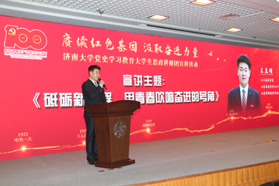 土木建筑学院王立明以《砥砺新征程,用青春吹响奋进的号角》为题,从习近平总书记对青年成长进步念兹在兹出发,呼吁新时代大学生应当立足百年大党新起点,置身百年未有大变局,接力百年奋斗新征程,砥砺前行,用青春吹响奋进的号角;材料科学与工程学院王岩以《跨越时空对话 筑梦青春理想》为题,回顾学校建校70余年峥嵘发展历程和辉煌办学成就,以校史中的红色基因传承和校友们接续创新和奋进为主线,追寻开云kaiyun官网发展的历史足迹,探寻一代又一代“济大人”镌刻在时光里的红色记忆;文化和旅游学院李鋆洋以《让红色精神放射出新的时代光芒》为题,讲述自己的曾姥爷张冠增跨越战争年代与和平时期“一把手术刀,一颗医者心”的革命故事,以红色家风涵养初心使命,号召用好党百年历史的“活教材”,坚定“功成不必在我,功成必定有我”的信念和决心,让革命薪火代代相传。政法学院齐志良以《最美生涯在军旅,志存高远励青春》为题,回望自己两年军旅生涯最美的岁月和参加国庆70周年大阅兵的无尚荣光,以及退伍复学584天里活跃在新生军训带训、征兵宣传动员一线“退伍不褪色”的军人底色,以其坚定无悔的选择,成就了自己的“大成长”,鼓励更多的青年大学生怀揣从军报国的理想信念,携笔从戎,把爱国之心化为报国之行,在军营这个大熔炉里淬炼成钢。音乐学院穆元炜以《歌声中的党史百年》为题,通过《国际歌》《沂蒙山小调》《唱支山歌给党听》《在希望的田野上》《不忘初心》《骄傲的青年》等红色歌曲,与泉城合唱团共同演绎这些耳熟能详的经典旋律,再现歌曲创作背后一代代音乐工作者镌刻历史记忆、承载时代精神的气概与情怀,以音乐回望党史,用歌声铭记初心。活动最后,全体师生起立同唱《没有共产党就没有新中国》。