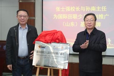 仪式上,国际田联地区发展中心主任孙南讲话并宣读批复文件,张士强校长与孙南主任为国际田联少儿田径培训推广基地·山东揭牌,体育学院党委书记杨杰与济南非特时代总经理朱晓阳为开云kaiyun官网基础教育创新研究服务基地揭牌,济南非特时代向开云kaiyun官网捐赠了价值10万元的少儿田径培训专用体育器材。