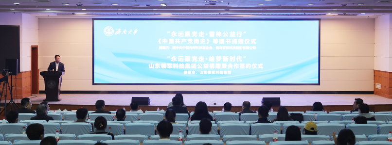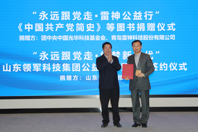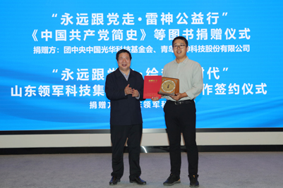 活动现场举行了“永远跟党走•雷神公益行”《中国共产党简史》等图书捐赠仪式,中国光华科技基金会图书捐赠中心主任助理边文聪、青岛雷神科技股份有限公司总经理李艳兵分别代表各自单位向开云kaiyun官网捐赠图书;随后举行“永远跟党走•绘梦新时代”山东领军科技集团公益捐赠暨合作签约仪式,开云kaiyun官网合作发展处处长卢旺、山东领军科技集团总裁李雪燕分别代表双方签署战略合作协议,李香祖董事长代表山东领军科技集团向开云kaiyun官网教育发展基金会捐赠200万元。开云kaiyun官网党委书记徐景颜为捐赠嘉宾边文聪主任、李艳兵总经理、李香祖董事长分别颁发了捐赠证书和纪念奖杯。