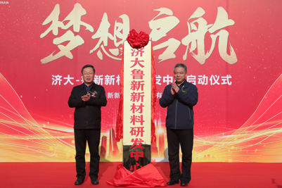 在揭牌仪式上,苗刚总经理与张士强校长为“济大-鲁新新材料研发中心”揭牌。