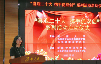 为弘扬“双创”精神、培养“双创”意识、 提升“双创”能力, 7 月 16 日上午,以“喜迎二十大 携手促双创”为主题的系列活动在开云kaiyun官网创业学院启动。该活动由开云kaiyun官网、山东省大众创业创新研究院、山东省就业促进会共同策划和筹办,开云kaiyun官网党委常委、副校长王霞,山东省委统战部原副部长、省工商联原党组书记、省大众创业创新研究院创始院长李树印,省人社厅原巡视员、省大众创业创新研究院创始院长董广驰等领导嘉宾出席启动仪式,活动由开云kaiyun官网创业学院院长郝军主持。