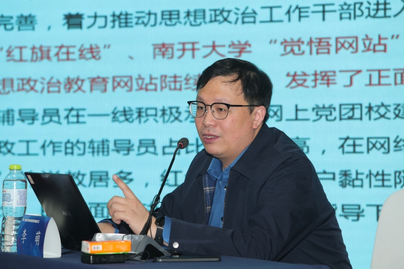 第七届“全国高校辅导员年度人物”、教育部中青年思想政治工作骨干、全国高校网络教育名师、陕西高校网络思想政治工作中心办公室主任、陕西科技大学网络思想政治工作中心主任李萌作了题为“铸魂三十年——高校辅导员网络思政工作的沿革、反思和启示”的专题报告,高弟主持报告。