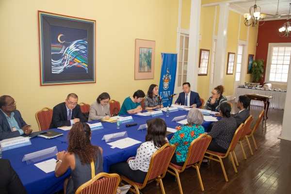 在西印度大学奥古斯丁分校,代表团与西印度大学奥古斯丁分校校长洛丝▪马丽及学校相关部门、学院负责人进行座谈,双方就语言文化学习、社会科学、工程学等方面的合作进行互动交流。会后,代表团参观了学校教学楼、图书馆、实验室等。