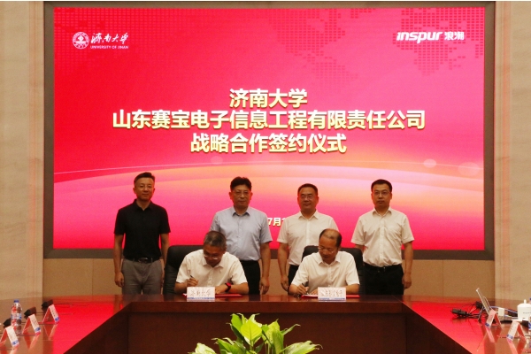 数学科学学院院长孙元功与山东赛宝电子董事长、总经理蒋孝军签署战略合作协议,杨景波与张峰为基地揭牌,活动由浪潮科技党委委员、副总经理朱家兵主持。