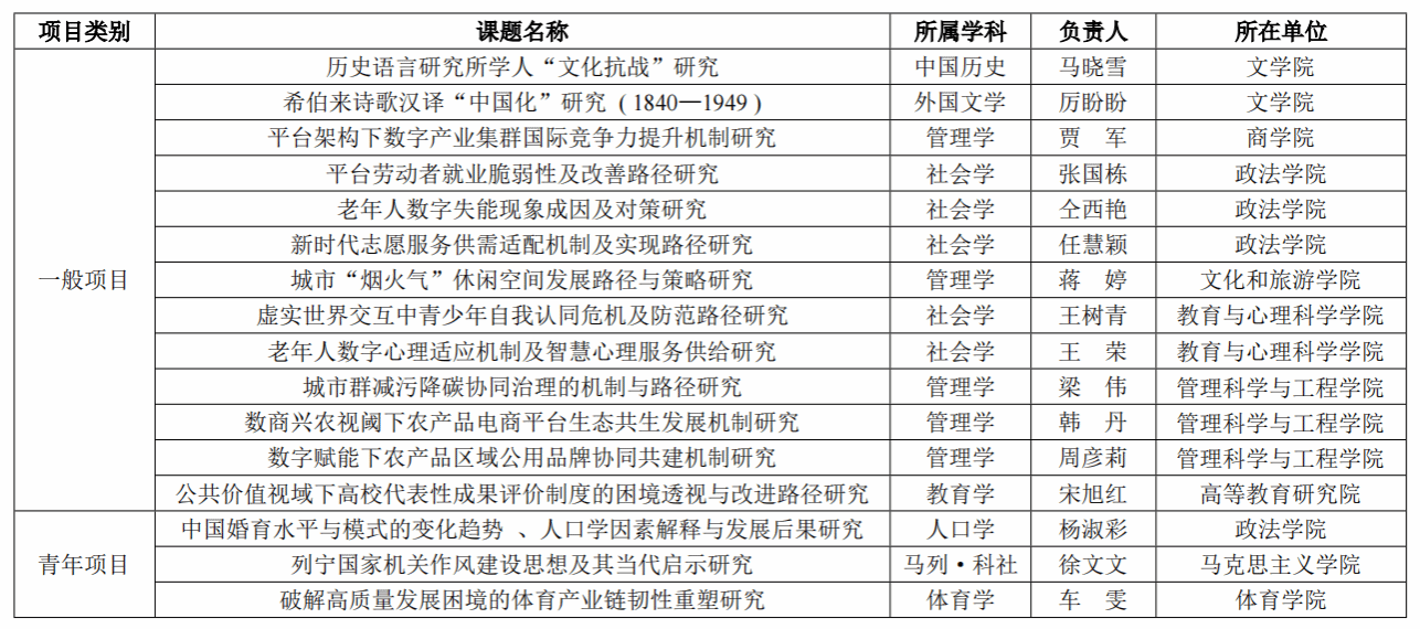 2023年度,开云国家社会科学基金立项课题分属于8个文科学院、科研平台,其中政法学院4项,管理科学与工程学院3项,文学院、教育与心理科学学院各2项,商学院、马克思主义学院、体育学院、文化和旅游学院、高等教育研究院各1项。立项课题分布于7个学科,其中管理学、社会学各5项,教育学、马列·科社、人口学、体育学、外国文学、中国历史各1项。开云社会学学科立项数量排名全国高校并列第1位,管理学学科立项数量排名全国高校并列第7位。