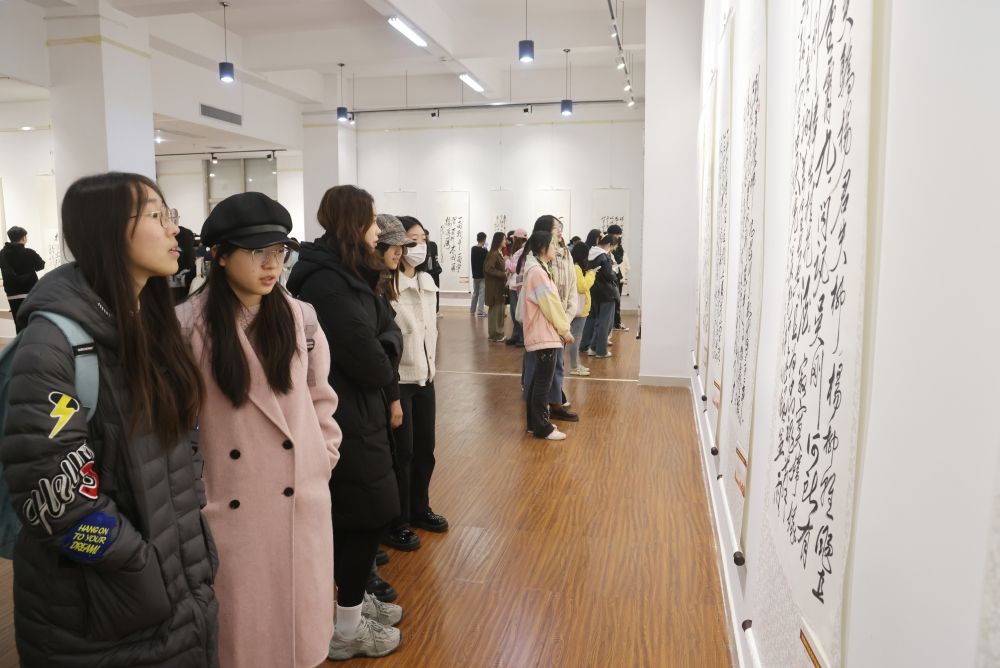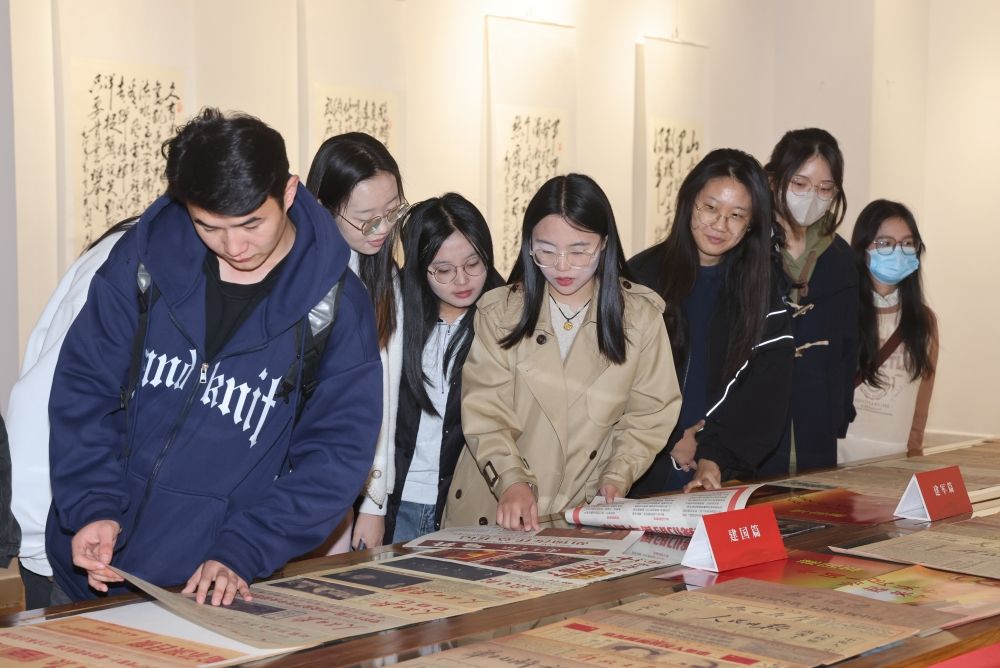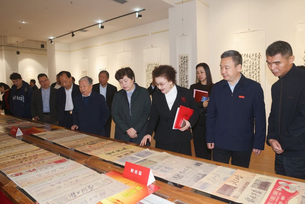 仪式结束后,与会嘉宾和师生代表前往学校舜道艺术馆参观贺惠邦先生手书毛泽东诗词楹联题词作品展。大家在一幅幅书法作品前驻足观赏或拍照留念,感悟毛体书法的恢弘气势和毛泽东诗词楹联题词深厚的思想内涵和特有的文学魅力。馆内陈列的《没有共产党就没有新中国》百年馆藏报纸,展示了中国共产党波澜壮阔百年历史的红色印记,一张张珍贵史料吸引了大家的目光、引发了大家的热议。