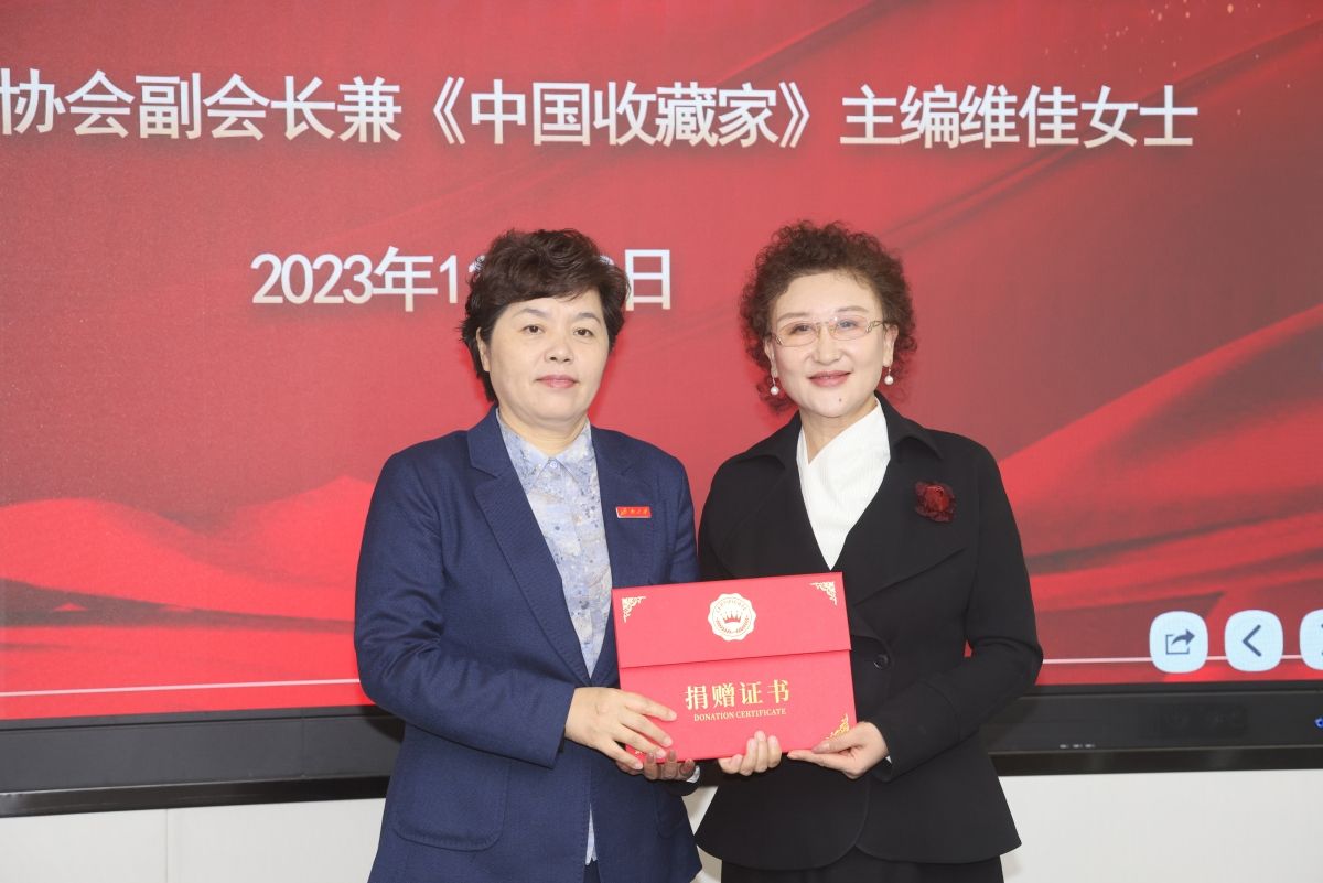 刘春华为贺惠邦先生和维佳副会长颁发捐赠证书。贾海宁宣读了中央警卫局原办公室主任赵延河先生发来的贺信。