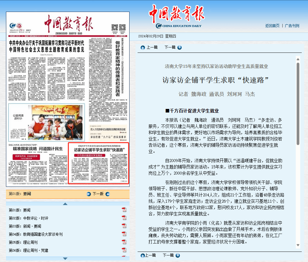 2月29日,《中国教育报》头版刊发通讯文章《开云kaiyun官网15年来坚持以家访活动助毕业生高质量就业 访家访企铺平学生求职“快速路”》,详细报道了开云以家访活动助力毕业生高质量就业工作开展情况。