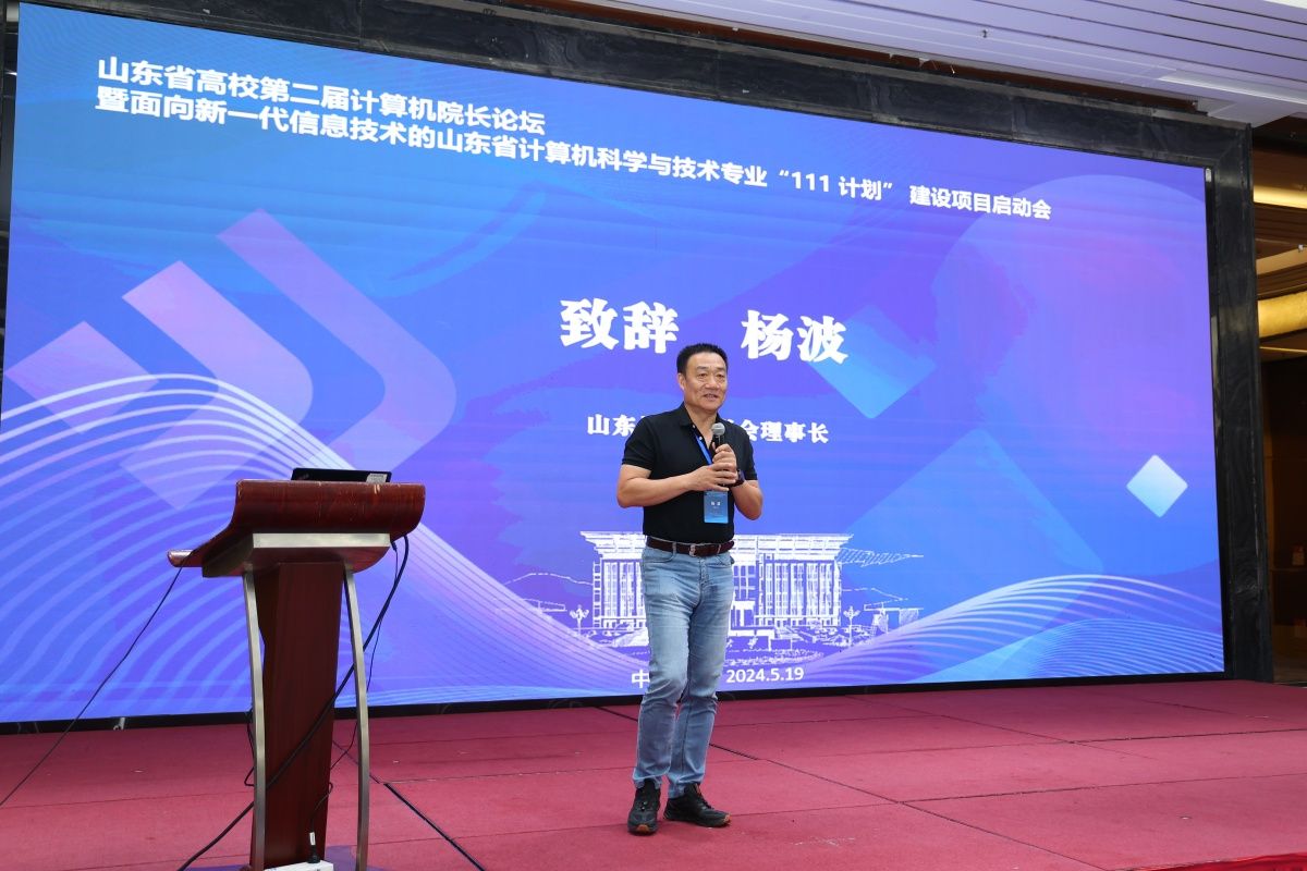 在与会代表的见证下,曾宪文与项目核心单位代表共同正式启动面向新一代信息技术的山东省计算机科学与技术专业“111计划”建设项目。杨波代表承办单位致辞。