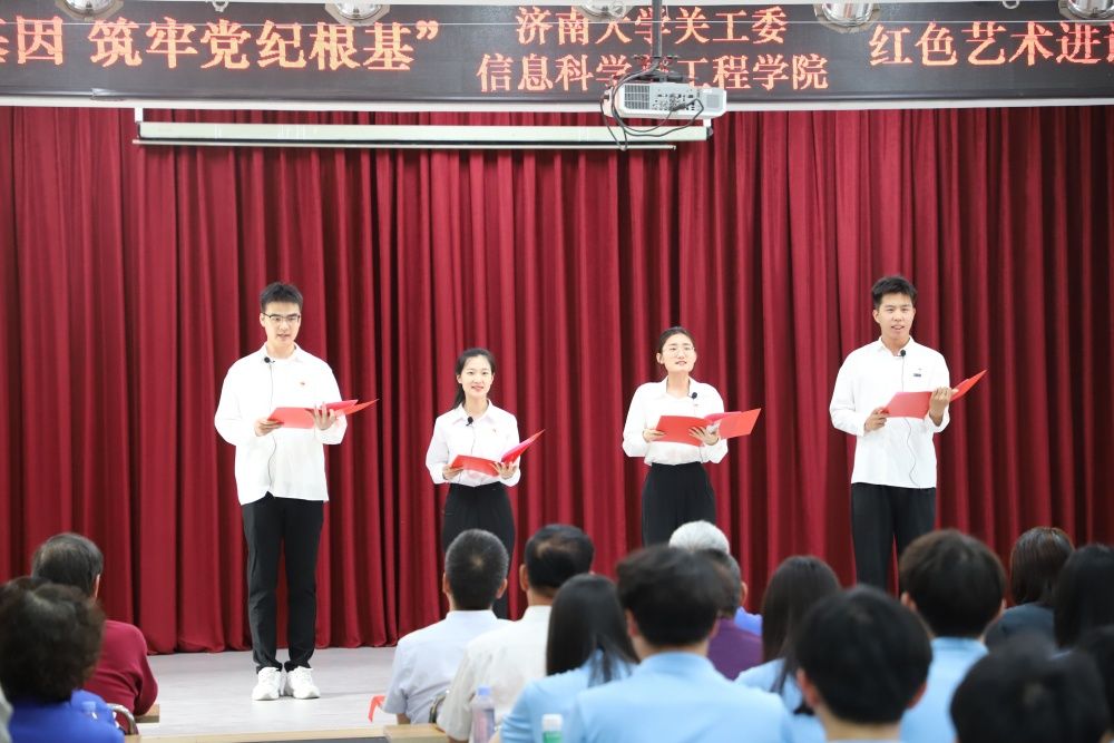 活动开始前,学校关心下一代工作委员会秘书长、离退休工作处处长高卫红和信息科学与工程学院党委书记夏卫东分别致辞,介绍了活动背景、活动目的和意义。活动在经典红色朗诵《孔繁森之歌》中拉开帷幕,朗诵者声情并茂的讲述了“青山处处埋忠骨,一腔热血洒高原”孔繁森的感人事迹。随后,济南市朗诵艺术家协会主席华青等十余位校内外老艺术家、老教师带来了《英雄本色》《我是共产党员我没有忘记》《一双布鞋和满坡的迎春花》《人生岁月》等红色经典文艺作品,讲述了以“失踪”33年的志愿军战士柴云振为代表的革命先烈的英雄事迹。开云kaiyun官网原工会主席张洪安创作的《济大的秋天》深情讲述了学校建校75周年艰辛光荣的发展历程,表达了学校全体师生争创“一流”的坚定决心和信心。信息科学与工程学院廉扬等学生党员的诗朗诵《廉洁颂》则向党组织表达了新时代青年坚守初心使命、铭记修身立德的郑重承诺。信息科学与工程学院组织员李童童以一首《又唱浏阳河》将现场气氛带到高潮,现场气氛热烈,掌声阵阵。最后,文艺展演在全体党员齐声合唱《歌唱祖国》中落下帷幕。