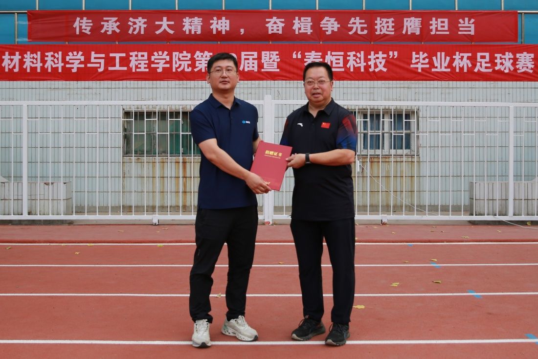 忽而微风,吹来盛夏,时光不曾停留,毕业如约而至。为促进师生间交流,追忆青葱岁月,6月14日,材料科学与工程学院在北苑操场举办了第39届暨2024年“秦恒科技”毕业杯足球赛。校长刘宗明,党委常委、副校长黄加栋,党委常委、宣传部部长贾海宁,合作发展处等部门、山东秦恒建筑节能科技有限公司总经理姜永鑫等部分校友、部分在材料科学与工程学院学习和工作过的教师参加活动。期间,刘宗明校长为姜永鑫校友颁发捐赠证书,师生合影留念。