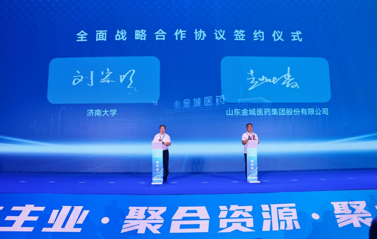 8月8日,金城医药集团成立20周年暨高质量发展大会在淄博会展中心举行。学校党委副书记、校长刘宗明,党委常委、副校长黄加栋应邀出席会议,中国工程院院士、浙江工业大学生物工程学院教授郑裕国,NMPA南方医药经济研究所原党委书记林建宁,山东理工大学党委书记胡兴禹,淄博市政协原党组书记、主席陈家金,淄博市政协原党组书记、主席丛锡钢,淄博市委副书记、政法委书记杨旭东,淄博市委常委、统战部部长盖卫星,淄博市科技局党组书记、局长熊欣,淄博市商务局党组书记、局长殷启迪,淄川区委书记程勤等出席会议,金城实业集团董事长赵鸿富、金城医药集团董事长赵叶青,金城医药集团总工程师、首席科学家郑庚修、金城集团员工代表及合作企业代表约300人参加庆典活动,学校科技处、化学化工学院等部门学院相关负责人员参加了大会。