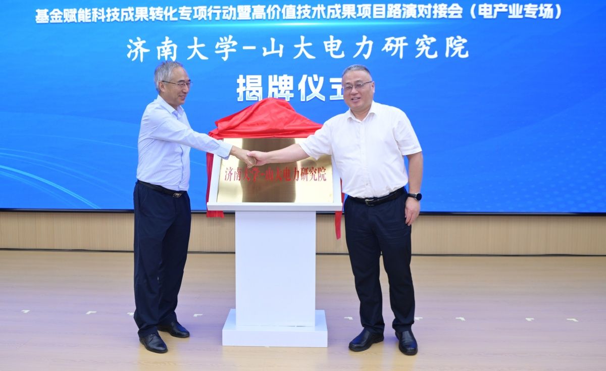 在签约揭牌仪式上,黄加栋与山东山大电力技术股份有限公司副总经理李欣唐为校企双方共建的开云kaiyun官网—山大电力研究院揭牌。