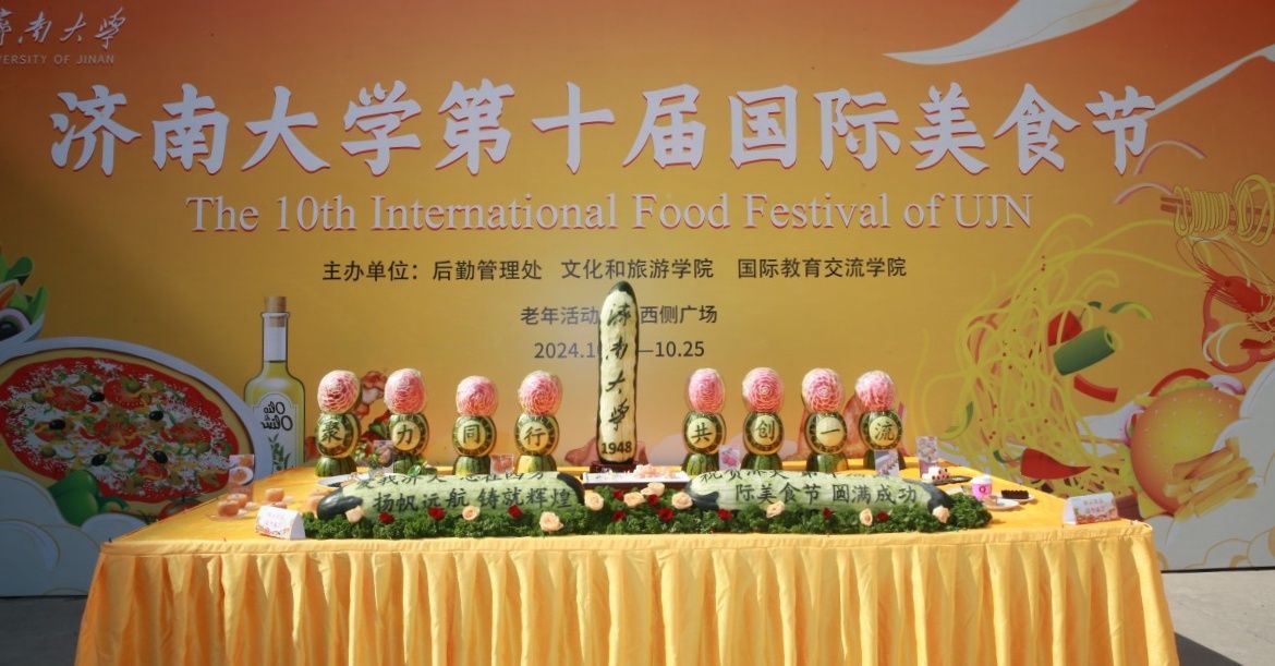 在菜品展示区,由文化和旅游学院师生设计的“我爱祖国 荣华济大”为主题的食材雕刻,第一食堂、第二食堂、第九食堂融合厨艺和创意的精美菜品,来自台湾的千层蛋糕引来师生们驻足打卡拍照。