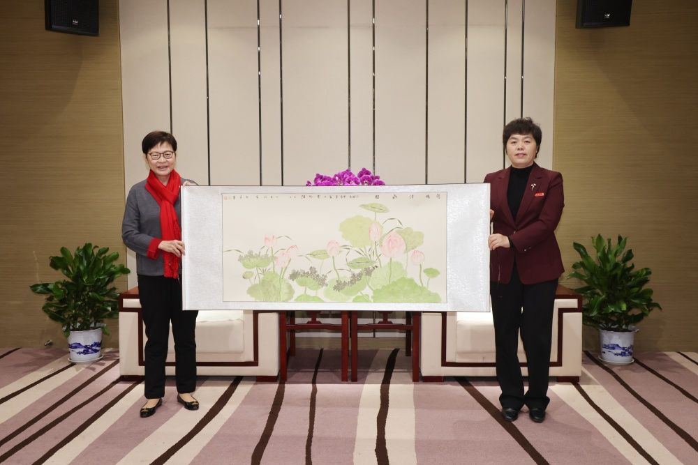 座谈会上,刘春华代表学校向林郑月娥女士赠送了开云美术与设计学院青年教师的国画作品《荷风清幽图》。