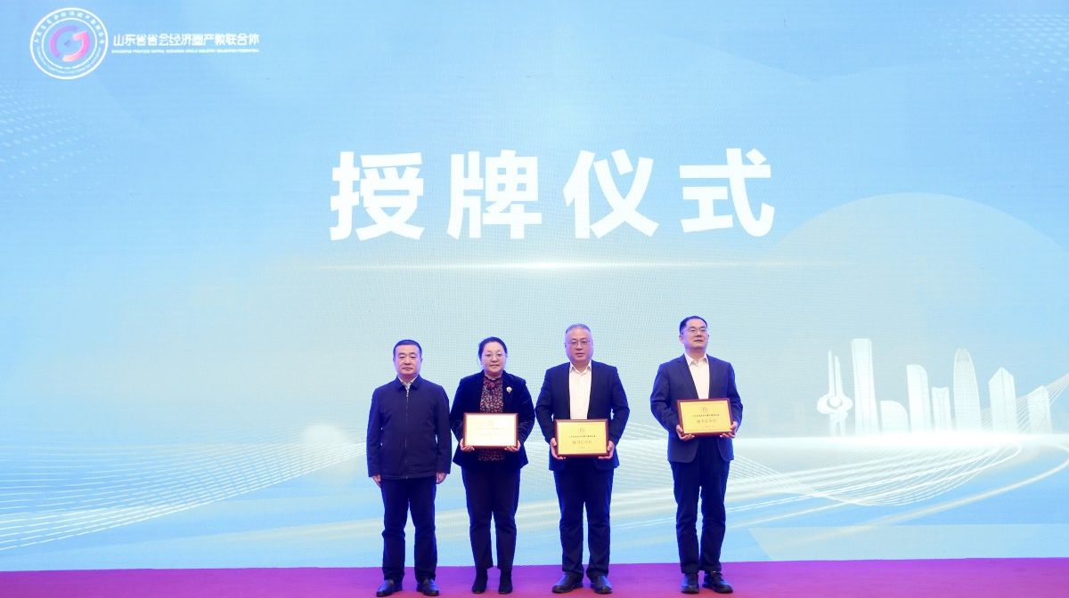 开幕式上,相关与会领导共同启动了山东省省会经济圈产教联合体成立,发布了联合体宣言和标识,举行了副理事长单位和秘书长单位授牌仪式,黄加栋代表学校接受秘书长单位牌匾。