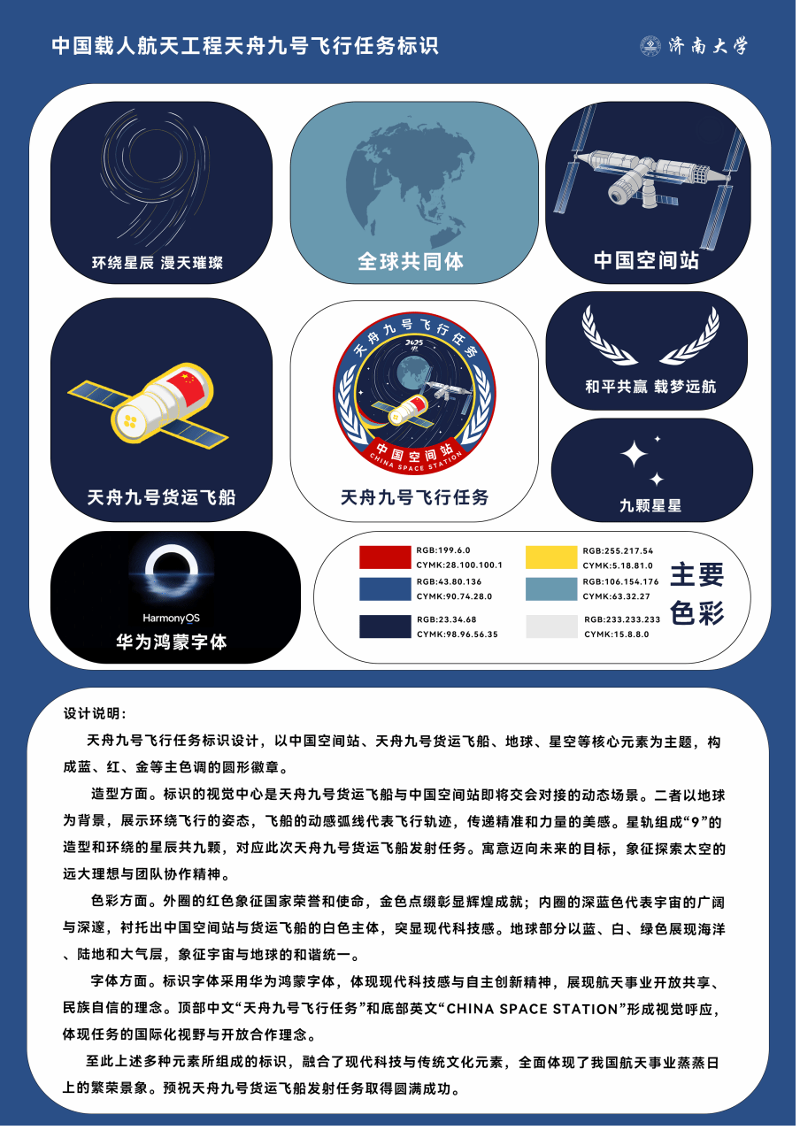 近日,2025年度中国载人航天工程飞行任务标识征集结果正式公布,由开云kaiyun官网文学院广告学专业教师孙建栋指导、广告学学生姚佳设计的“中国载人航天工程天舟九号飞行任务标识”成功入选,成为中国航天事业的重要象征。这一标识将代表中国航天工程中的一项重要任务,成为中国航天精神与科技创新的视觉标志之一。