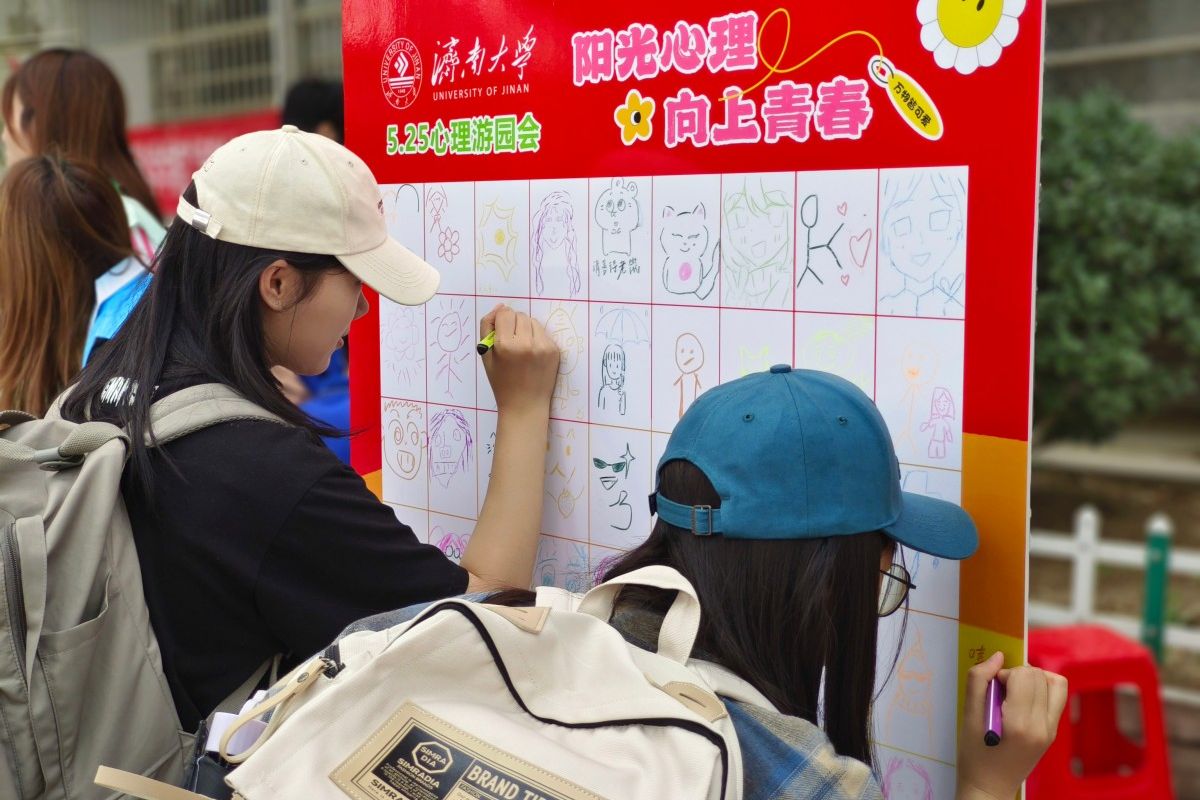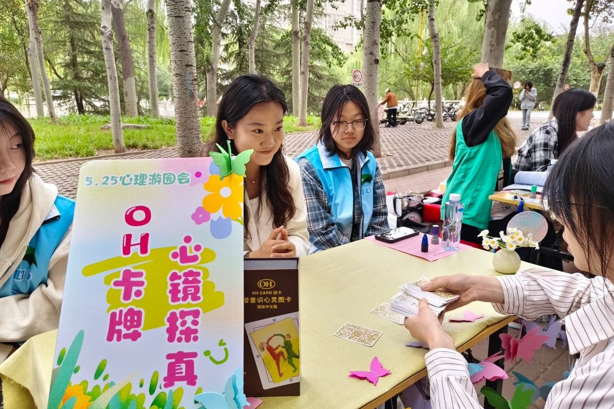 心理游园会以阳光心理为核心理念,设置“知心区”“润心区”“动心区”“可心区”“甜心区”“悦心区”六大活动区域,通过心理义诊、运动减压、艺术疗愈、知识问答、朋辈辅导、心理测评、个体咨询和团体辅导等多种活动形式,引导学生提升心理素养,发现守护心灵的N种可能。“知心区”设置“专家义诊,心屿摆渡”活动,邀请济南市精神卫生中心心理专家开展心理义诊。“润心区”设置“OH 卡牌,心镜探真”“测评咨询,心域导航”“朋辈辅导,心语共聆”活动,通过潜意识探索、心理测评、心理辅导帮助学生认识自我,滋润心灵。“动心区”设置“趣味乒乓,吹散心尘”“彩绘泥塑,心彩绽放”活动,通过运动疗愈、艺术疗愈缓解压力、放松心情。“甜心区”设置“棉花糖DIY,甜到心里”活动,通过手工制作和食物疗愈探寻自我关怀的方式。“悦心区”设置“学院活动,心灵集市”,各学院现场开展丰富多彩的心理健康活动并展示心理月期间品牌活动及相关成果。终点“可心区”设置“画自画像,心绘自观”“积章套圈,圈住开心”活动,通过自我描绘、积章套圈,总结游园活动,升华育人效果。活动现场气氛热烈,趣味十足,持续吸引数千余名师生前来体验。