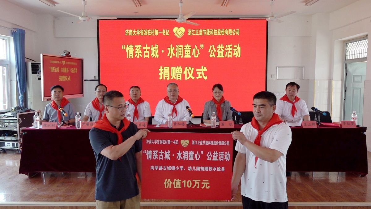 张玉贺代表浙江正蓝节能科技股份有限公司向古城镇小学、幼儿园捐赠了价值10万元的饮水设备。他在讲话中承诺,浙江正蓝节能科技股份有限公司将持续践行社会责任,助力乡村振兴。据悉,此次捐赠的饮水设备将覆盖古城镇2所小学和1所幼儿园,惠及千余名师生。