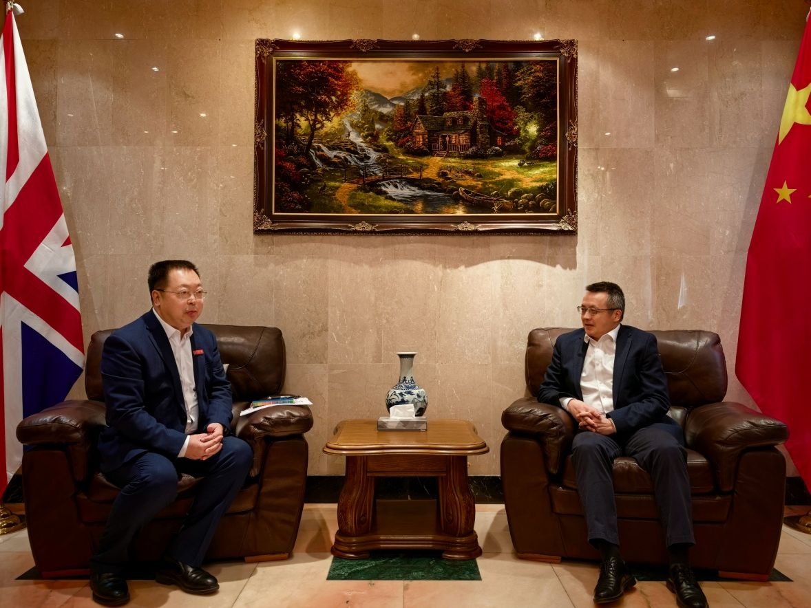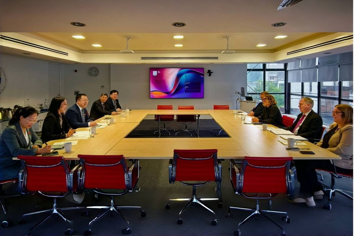 访问期间,代表团拜访了中国驻爱丁堡总领事馆,与张彪总领事座谈交流。刘宗明首先介绍了学校近年事业发展及此次访英情况,他表示学校重视对英合作,尤其是对苏格兰地区合作,目前学校已与格拉斯哥加利多尼亚大学建立深厚合作关系,希望后续可以在总领馆支持下进一步推动与苏格兰地区相关高校合作。张彪总领事对代表团到访总领馆表示欢迎,并介绍了苏格兰高等教育及对华合作基本情况,希望学校能发挥学科优势,开拓思路,在合作办学、科研合作等领域不断深化与苏格兰地区高校合作。