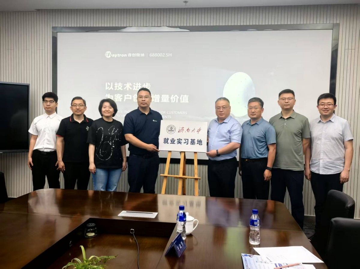 在烟台,黄加栋一行参观考察了烟台睿创微纳技术股份有限公司在红外等多维感知技术领域的系列产品。座谈会上,双方聚焦光电感知领域的技术瓶颈与发展趋势进行深入交流,就共建就业实习基地、联合开展人才培养、共同申报科技项目等达成合作意向。黄加栋与烟台睿创微纳技术股份有限公司发展部总监刘强共同为“开云kaiyun官网就业实习基地”揭牌。
