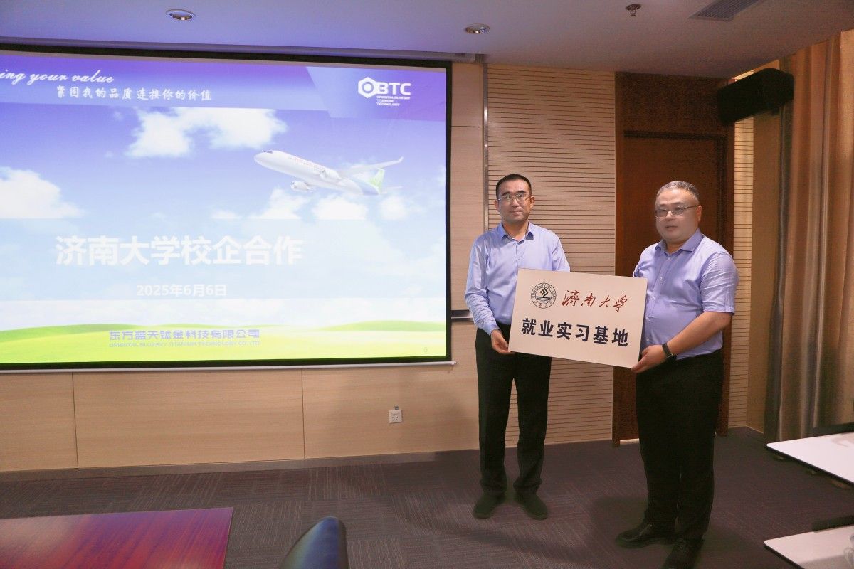 在烟台,黄加栋一行实地考察了东方蓝天钛金科技有限公司构件成型、精加工及检测生产线。座谈会上,双方围绕企业在新材料、智能制造、新一代信息技术等领域的技术需求进行了交流研讨,在科技项目联合申报、关键技术协同攻关、定向人才培养等方面达成共识。黄加栋与东方蓝天钛金科技负责人王肇宇共同为“开云kaiyun官网就业实习基地”揭牌。