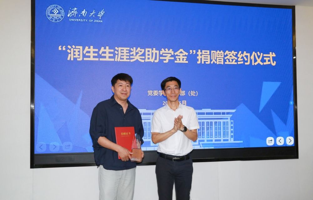仪式上,播放了“润生生涯奖助学金”历届获奖助学生代表录制的祝福视频。孙翠翠总经理和学校合作发展处副处长、校友工作办公室副主任、教育发展基金会办公室副主任景丽萍签订了新的捐赠协议。李强为孙凯董事长颁发捐赠奖杯、证书及《润生生涯奖助学金五周年纪念册》。获奖学生代表在发言中感谢孙凯学长为济大学子做出的榜样,表示将不辜负奖励与期待,更加努力学习,全面发展。化学化工学院党委副书记白雪飞、体育学院党委副书记郭桂芬作交流发言,介绍了“润生生涯奖助学金”在学院人才培养方面发挥的积极的作用,表示将进一步做好优秀学生选树工作,进一步发挥奖助学金示范引领作用,努力培养更多有理想、敢担当、能吃苦、肯奋斗的新时代好青年。