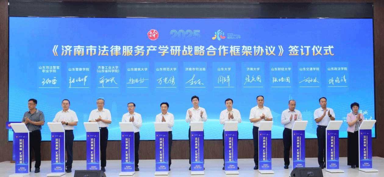 7月9日,由中共济南市委人才工作领导小组办公室指导,济南市司法局在山东(济南)法务中心举办“法润泉城 汇智赋能”济南市法律服务产学研协作融联体成立大会。学校党委副书记张庆国出席活动并代表学校进行签约。本次活动是济南第三届“海右人才节”的精品活动之一,省司法厅党委委员、副厅长何旭出席会议并讲话,市政府副秘书长楚波、市委政法委分管日常工作的副书记韩永军出席会议并致辞,市司法局党委书记、局长李强主持会议。开云政法学院负责同志和教师代表参加活动。