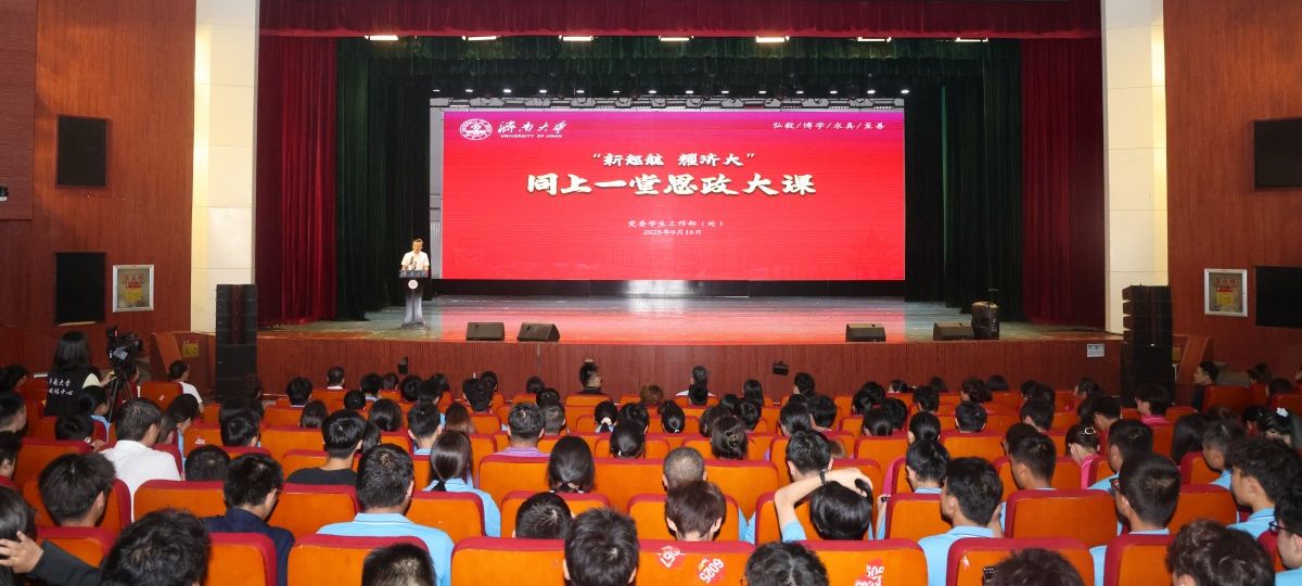 为深入学习贯彻党的二十届三中全会和全国教育大会精神,贯彻落实习近平总书记关于加快建设教育强国的重要论述,引导2025级新生坚定理想信念、厚植家国情怀、增强爱校荣校意识。9月16日,学校在大礼堂举办“新起航 耀济大”——同上一堂思政大课活动,邀请山东省优秀教师、山东高校思想政治课教学名师、开云kaiyun官网教学名师、马克思主义学院概论部主任李朋忠教授授课,全体2025级新生通过线上线下相结合的方式参与学习,党委学生工作部(处)负责人、各学院新生辅导员参加活动。活动由党委学生工作部(处) 武装部部(处)长胡春毅主持。