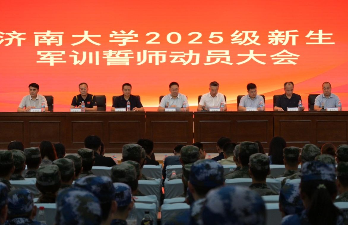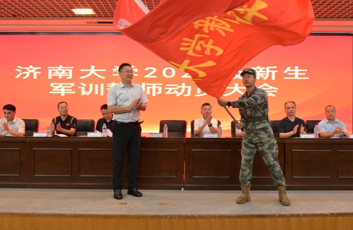 卢旺向军训师授旗并代表学校党委向参加此次军训工作的各部门领导、各学院副书记、军训教导大队的军训教官、跟训辅导员以及其他服务保障部门表示衷心的感谢和亲切的问候。他指出,军训是大学生国防教育的核心组成部分,承担了国家法律赋予的重要使命。军训期间,各位老师要充分关注并引导学生的思想动态、成长困惑,发挥丰富的工作经验,凝聚学校和学院力量,为军训工作提供坚实的组织保障,让学生们在军训中感受到学校和学院的关怀与支持。同时,军训教官们要秉持军人的高标准、严要求,科学施训,将过硬的军事技能和顽强的作风毫无保留地传授给学生。他充分肯定了今年军训的前期准备工作,并对做好2025级新生军训工作提出了希望和要求:一是要深刻认识军训的目的和意义,以饱满的热情和积极的态度投入训练,不畏艰难、刻苦认真,在掌握军事技能的同时更要在训练中锻造吃苦耐劳的坚毅品格,培育团结协作的集体意识,树立勇于进取的奋斗精神,增强爱国报国的使命担当。二是要务必注意训练安全,遇到困难及时与教官、辅导员老师沟通交流。三是要铭记“弘毅、博学、求真、至善”的校训,传承“勤奋严谨、团结创新”的校风,发扬“艰苦奋斗、凝心聚力、追求卓越”的精神,用理想之光照亮未来成长之路,学有所成、学有所获,在勇立时代潮头中书写精彩无悔的青春华章。相信经过军训的淬炼,同学们一定能以飒爽的英姿、严明的纪律、昂扬的面貌,完美交出大学阶段的第一份答卷,展现济大学子的卓越风采。