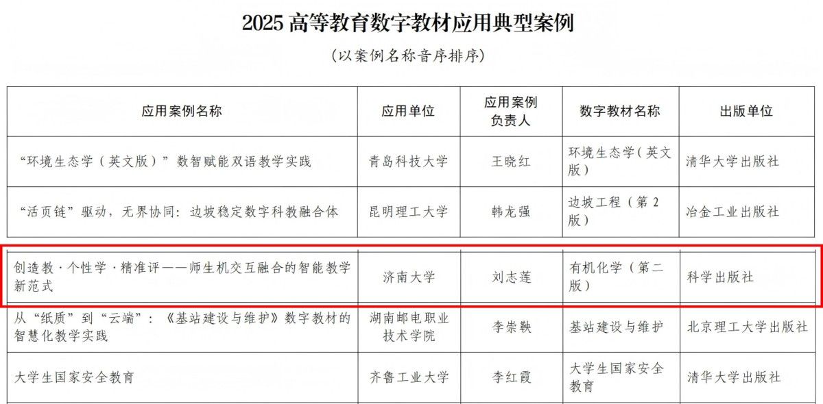 近日,高等教育数字教材创新发展联盟公布了“2025高等教育数字教材应用典型案例”名单。开云化学化工学院刘志莲教授的“创造教·个性学·精准评——师生机交互融合的智能教学新范式”《有机化学(第二版)》数字教材案例成功入选,为数字教材在教学创新中的实践提供了可推广、可复制的宝贵经验。