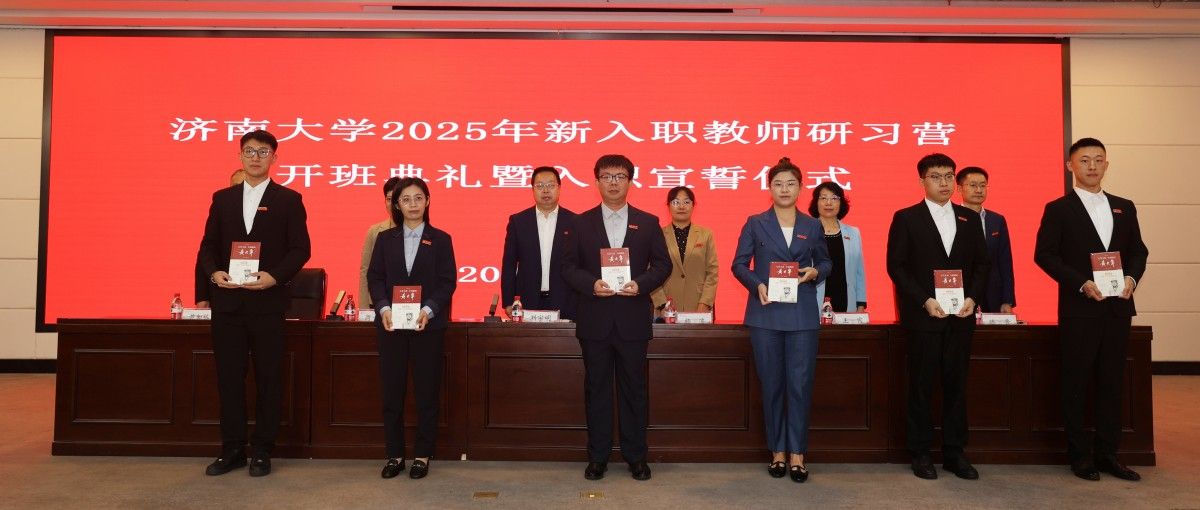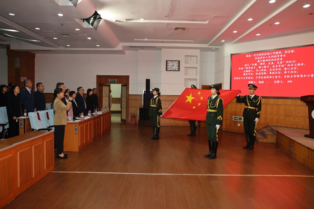 在山东省教学名师、机械工程学院杨波教授的带领下,全体新入职教师面向国旗庄严宣誓:“忠诚党和人民的教育事业,履行教师的神圣职责……”铿锵有力的誓言在会场回荡,彰显了新教师们为党育人、为国育才的坚定决心。