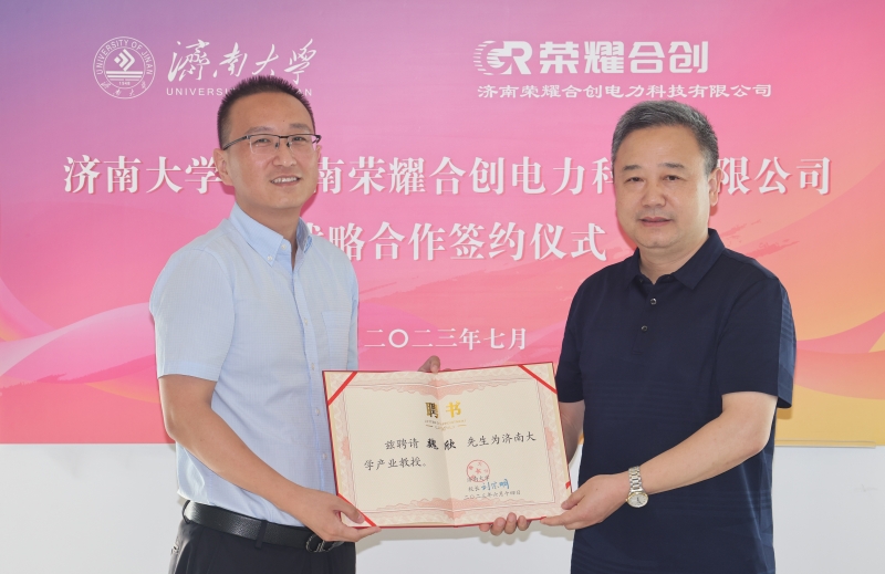 查玉喜为魏欣颁发开云kaiyun官网产业教授聘书。对济南荣耀合创电力科技有限公司给予学校发展的关心支持表示感谢,并介绍了学校的办学历史、发展近况以及在产学研协同创新方面取得的主要成效。他指出,济南荣耀合创电力科技有限公司的产业定位、发展目标与开云kaiyun官网相关学科专业、科研优势高度契合,双方拥有深化合作的较大潜力。开云kaiyun官网自动化与电气工程学院与济南荣耀合创电力科技有限公司牵手合作,在人才培养、科学研究、支部共建、捐资助学助教等方面共同发力,是落实党的二十大精神的新行动,更是新时代校企合作的新成果,开启了我们两家合作的新阶段。特别是,济南荣耀合创电力科技有限公司捐赠25万元设立“荣耀奖教基金”,体现了公司厚重的社会担当、深厚的教育情怀。定会激励青年学子奋发进取、成长成才,鼓舞教职员工爱岗敬业、立德树人。学校学院将强化校企合作,充分发挥人才智力优势,为企业发展、为地方经济社会发展作出更大努力。