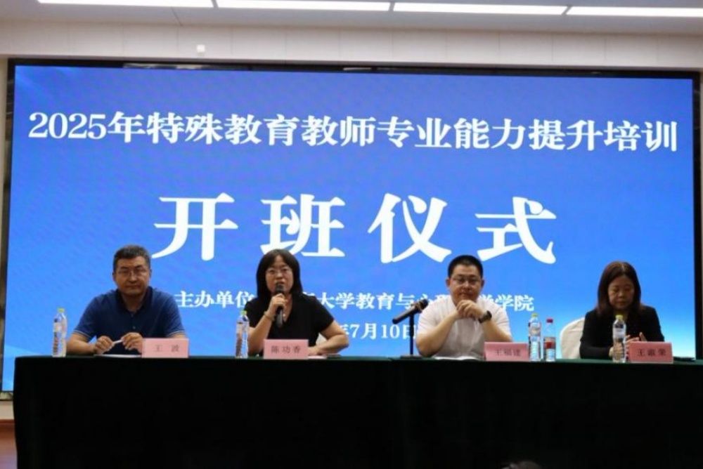 为全面提升山东省特殊教育教师专业素养与实践能力,推动区域特殊教育高质量发展。7月9日至13日,教育与心理科学学院在荣成市举办“特殊教育教师专业能力提升”专题培训班。来自全省各地的120余名特殊教育骨干教师齐聚一堂,共同参与此次培训。山东省教育科学研究院王福建部长、教育与心理科学学院院长陈功香、山东省特殊教育研究中心副主任王波等出席开班仪式并讲话。