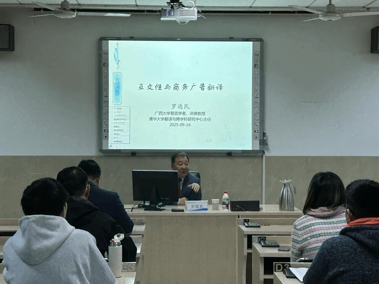 清华大学首批二级教授、广西大学君武讲席教授、亚太翻译与跨文化传播研究院院长罗选民,以“互文性与商务广告翻译”为题,从翻译的互文性这一微观理论出发,向师生讲解了商务广告的特点、广告翻译的要领等内容,并解释了互文性广告翻译的优势和特征,用自己的亲身经历和研究故事,生动地串联起互文性广告翻译的理论内容架构,给师生带来了一堂别开生面的、有趣有益的翻译课。讲座中设置了答疑环节,师生踊跃提问,罗选民教授耐心地一一解答,让师生获益匪浅。