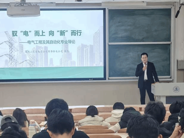 12月12日下午,自动化与电气工程学院2025级“启航讲堂”第五讲在第十一教学楼举办。本次讲堂邀请国网菏泽供电公司党委书记钱昆担任主讲嘉宾,给2025级新生带来《驭“电”而上,向“新”而行》的分享报告。