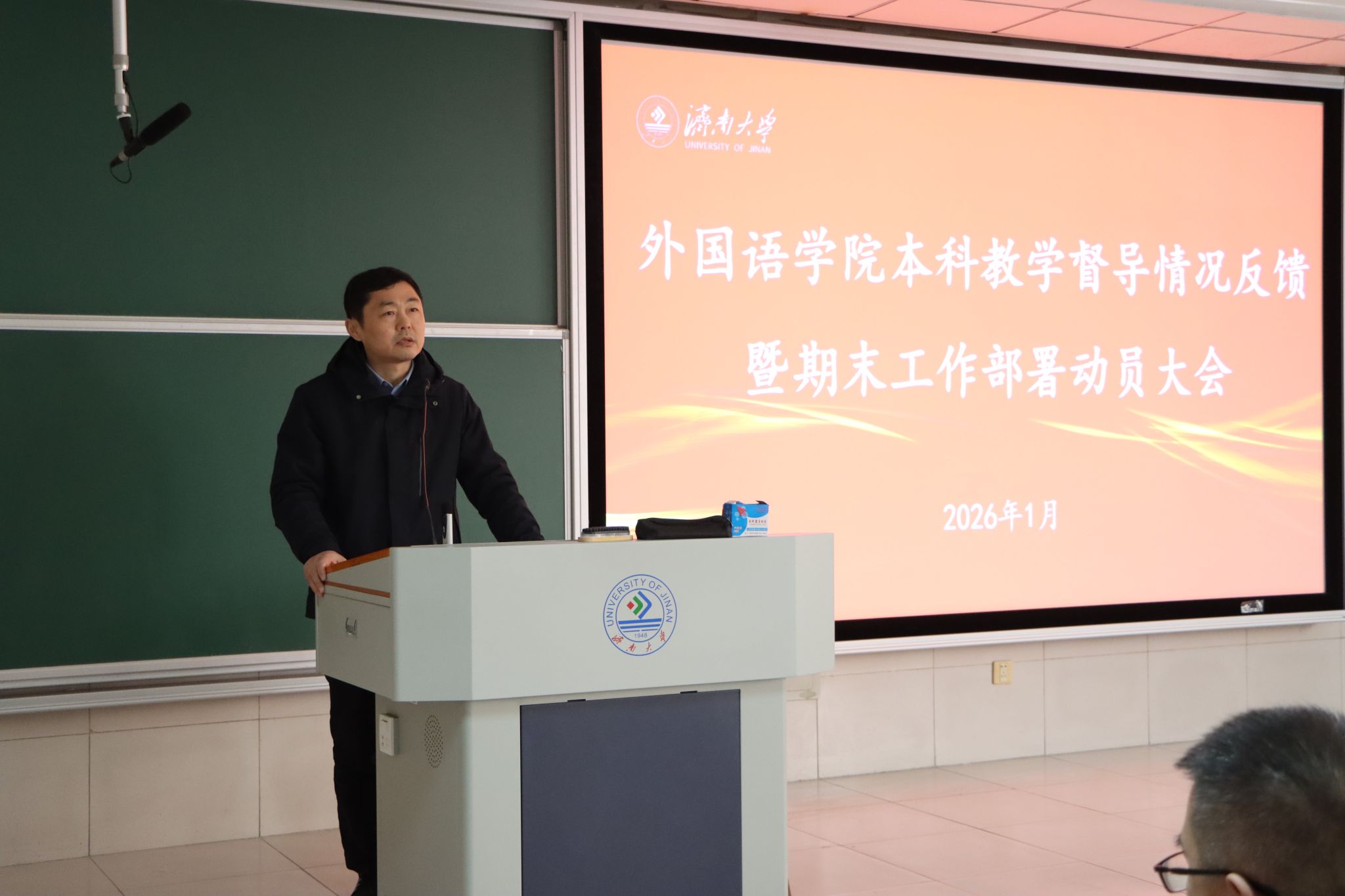 1月6日,外国语学院召开本科教学督导情况反馈暨期末工作部署动员会,校教务处副处长田传民,本科教学督导组组长王元秀,学院领导班子,学院本科教学督导员和全体教师参加活动。会议由外国语学院副院长王勇主持。