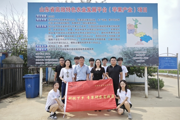 在威海市华峰三优富士专业合作社,实践团一行对当地苹果种植基地展开深入调研。队员们首先参观了苹果种植基地,通过现场讲解、交流讨论等方式,观察种植基地的苹果生长状况和生产设备,运用所学生物专业知识进行分析并提出相关问题,了解“公司+合作社+基地+标准+品牌”的一体化经营模式和“宽行、密植、矮砧、篱架”的集约化栽培模式。同时了解果园物联网、智慧肥水一体化灌溉系统对苹果生产的积极影响以及生产优势。队员们满怀学习热情与种植户交流研讨,切身体会从事农业种植的辛苦,开阔了视野,学到了课本以外的知识。