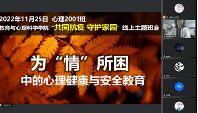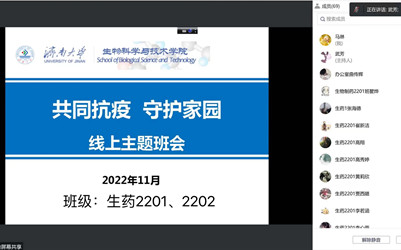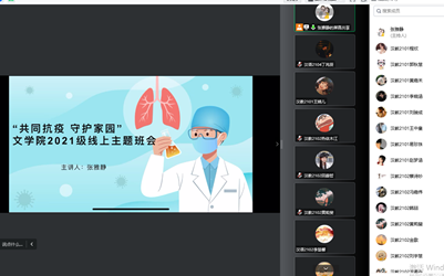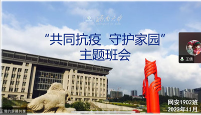 当前学校的疫情防控处于最吃紧的关键阶段,为了切实有效贯彻落实党和国家关于疫情防控的政策以及学校常态化防控、应急性处置的要求,做好疫情防控期间学生的教育、管理、服务等各项工作,解决学生实际问题、解答学生实际关切,党委学生工作部(处)起草发布《“共同抗疫 守护家园”疫情防控线上主题班会工作方案》;各学院结合当前实际,围绕弘扬抗疫精神、疫情防控形势、遵守学校防控规定、做好个人防护、安全隐患排查、思想教育引导、心理健康疏导、后勤服务保障等方面召开主题班会,让疫情防控“有力度”、暖心服务“有温度”、思政教育“有效度”。