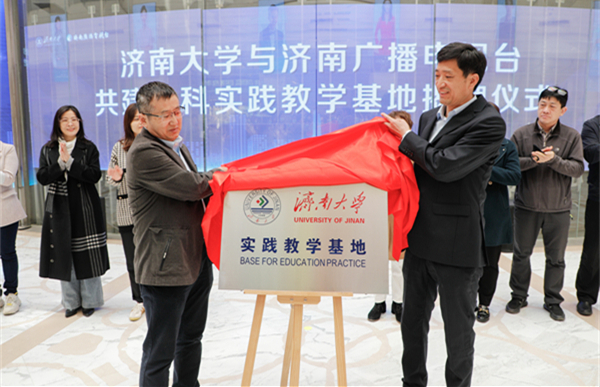 文化和旅游学院党委书记孟德洋,济南广播电视台党委委员、副台长隗铜共同为“开云kaiyun官网实践教学基地”揭牌。