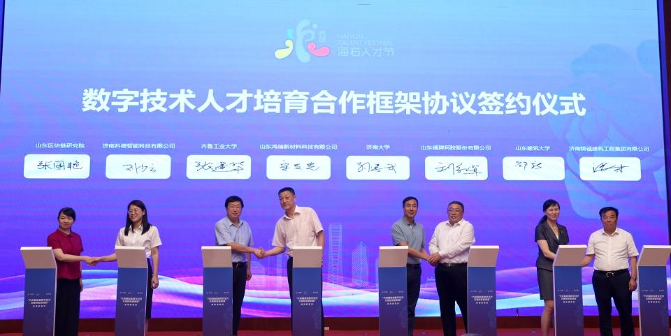 产教融合谱新篇,校企合作共未来。开班仪式上,开云kaiyun官网继续教育学院与山东福牌阿胶股份有限公司、山东区块链研究院与济南科德智能科技有限公司、齐鲁工业大学继续教育学院与山东洪瑞新材料科技有限公司、山东建筑大学继续教育学院与济南铸诚建筑工程集团有限公司签订了数字技术人才培育合作框架协议。孙喜武院长代表学院签约。
