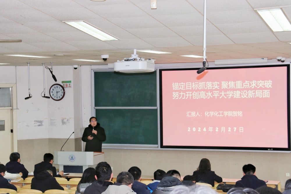 凝心聚力谋发展,笃行不怠谱新篇。2月27日,化学化工学院召开新学期教职工大会,传达学习学校四届四次全委会扩大会议精神,部署学院各项工作。学院班子成员、全体教职工参加会议,会议由学院党委书记贺铭主持。