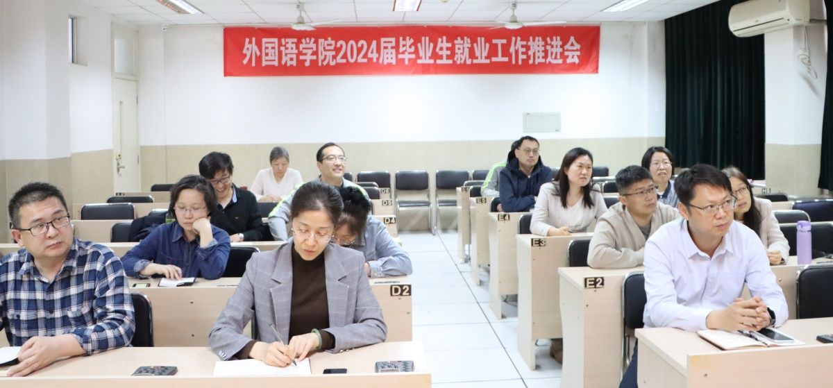 4月23日,外国语学院在第一教学楼召开2024届毕业生就业工作推进会,学院领导班子、各系部主任、毕业生辅导员、班主任参加会议。会议由外国语学院组织员李春海主持。