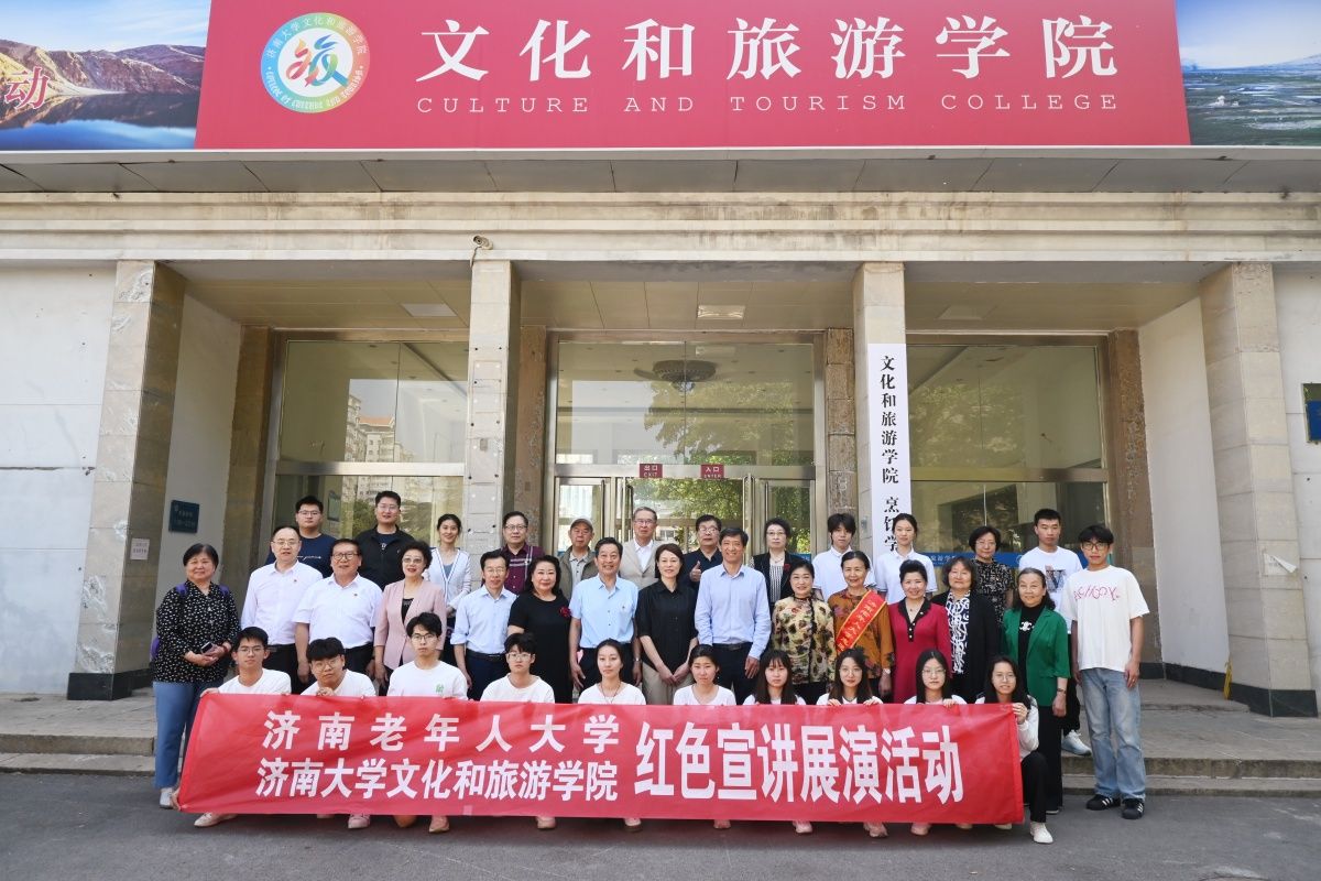 随后,济南老年人大学宣讲团和文旅学院的学生们为大家带来了一场精彩的红色文化主题文艺汇演。此次文艺汇演以传承红色基因、弘扬爱国主义精神为主线,以诗歌朗诵、红色电影配音、红色歌曲等形式讲述了革命先烈的英勇事迹和党的奋斗历程,讴歌了党的丰功伟绩和取得的辉煌成就,大家声情并茂、气势磅礴,深情抒发了对党和祖国的真挚感情。诗朗诵《太阳的形象》《大写的中国》《谁是最可爱的人》《济大的秋天》《可爱的中国》《军礼》《红色电影〈风暴〉台词》,红色歌曲《中华儿女》《老家在山东》《我和我的祖国》等一个个精彩节目,让在场的每一位观众都深受感动。