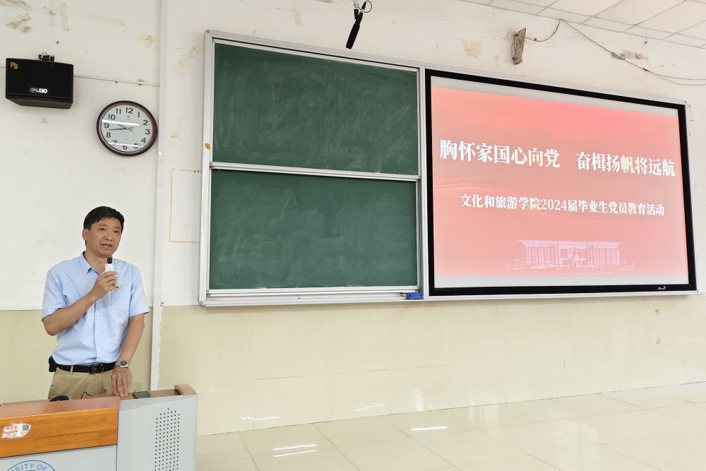 孟德洋为毕业生党员讲授了主题为《胸怀国家心向党,奋楫扬帆将远航》专题党课。他首先强调了加强党性修养与弘扬廉洁文化的重要性,他指出,作为新时代的青年党员,我们不仅要具备过硬的专业技能,更要拥有坚定的理想信念和高尚的道德情操。在理论学习中净化心灵,在实践探索中锤炼品格。并通过一系列典型事迹和反面案例的对比,生动诠释了“青”与“廉”如何在青年党员的成长道路上相辅相成。最后,孟德洋对毕业生党员提出三点希望:一是牢记党员身份,强化责任担当,不断提高自身党性修养,发挥党员先锋模范作用;二是坚守党纪底线,对党忠诚,一切从群众根本利益出发,保持党员先进性和纯洁性;三是铭记文旅人身份,用实际行动践行党的宗旨和理念,在未来的岗位上发光发热,为母校的发展贡献力量。