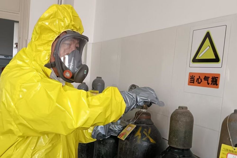 在学院党委书记贺铭的指挥下,演习正式开始。逸夫楼B319实验室模拟硫化氢气瓶泄漏,气体报警器随即报警。实验指导教师张卫民、张晶迅速引导学生有序撤离至一楼大厅,并清点人数,确保学生安全。学院实验室安全负责人赵阳向总指挥汇报情况后,总指挥命令按应急预案行动,保障人员安全,减轻对实验室资产和设备的损害,并展开救援。急救人员穿戴防护装备,关闭气瓶阀门,防止气体扩散,安全处置事发现场。