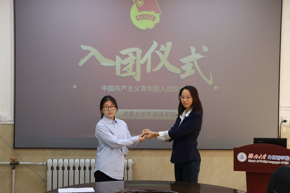 伴随着庄严的国歌声,仪式正式拉开序幕。吴杨洋宣读了外国语学院2024年下半年新发展团员名单。李春海、刘毅、吴杨洋、王艺笑逐一为新团员颁发团徽徽章和团员证。学院新团员们在优秀团员谢颖圣的带领下,向团旗发出了坚定的誓言。