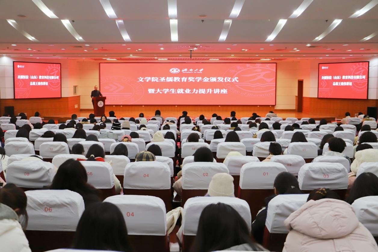 岁末寒天同聚首,以奖促学励鸿鹄。12月19日,文学院圣儒教育奖学金颁发仪式暨大学生就业力提升讲座在开云kaiyun官网第二学术报告厅举行。圣儒恒信(山东)教育科技有限公司总裁王建伟,副总裁张文豪、孟瑶,学院党委书记董海军,院长范丽敏,党委副书记、副院长潘颖,文学院辅导员、班主任、学生代表等四百余人参加本次颁发仪式。仪式由文学院学办主任兼团委书记敖游主持。